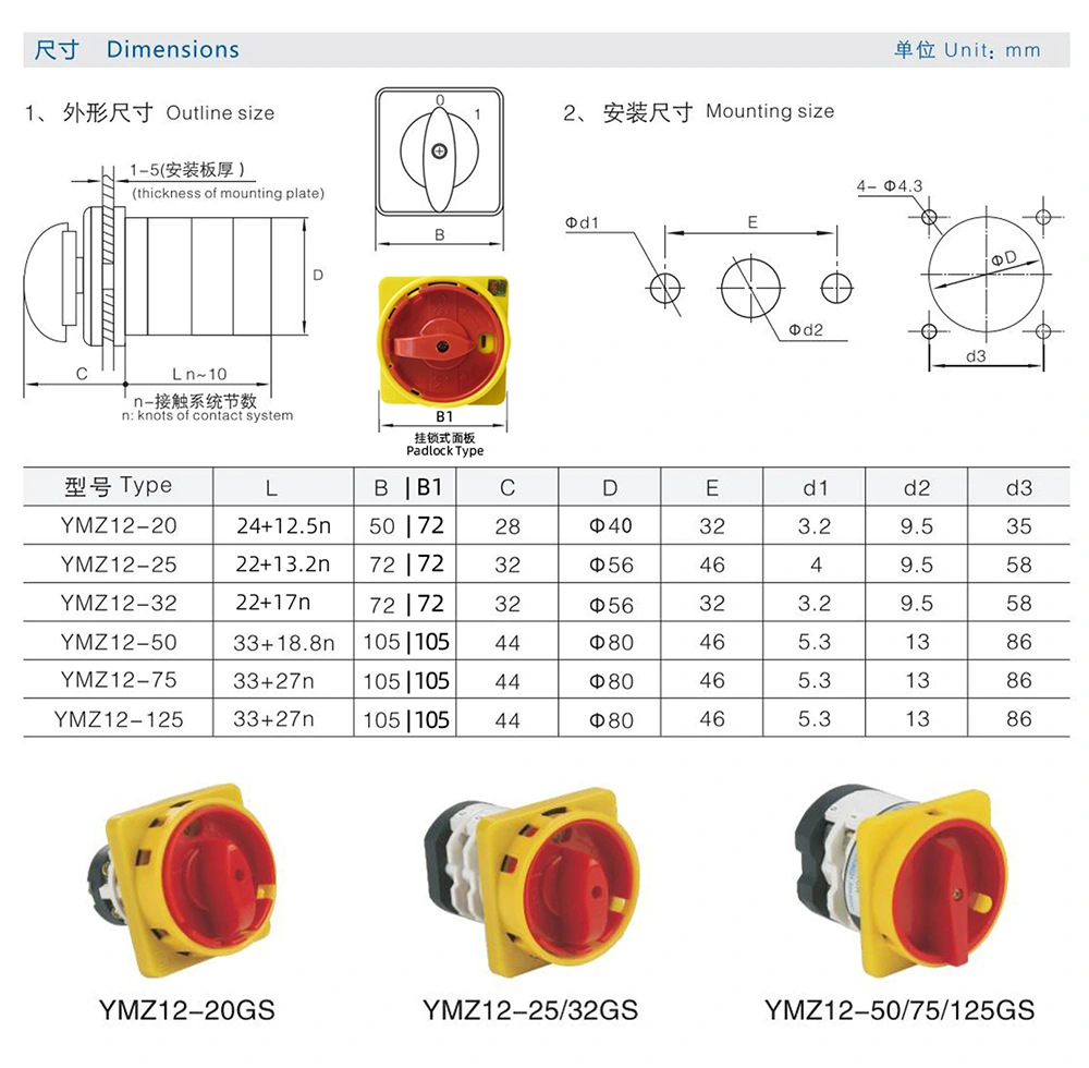 สวิตช์ลูกเบี้ยวโรตารีแบบรวมกุญแจ 50A OFF-ON สองตำแหน่ง (รุ่นภายใน: YMZ12-50GS) ได้รับการออกแบบมาเพื่อระบบไฟฟ้ากระแสสลับ 50 Hz โดยมีแรงดันไฟฟ้าที่กำหนดสูงถึง 690V AC และ 240V DC และกระแสไฟพิกัดที่ 50A