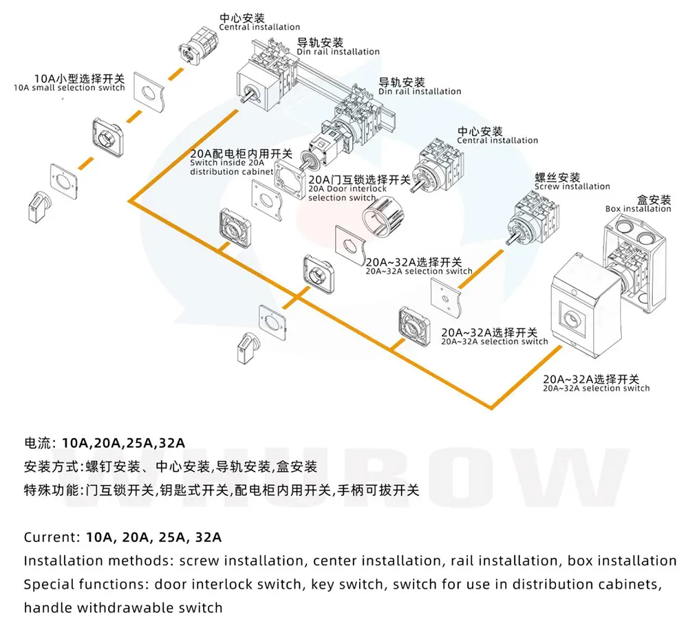 - สวิตช์ลูกเบี้ยว 32A: ใช้มุมการวางตำแหน่งที่ 30°, 45°, 60°, 90° เช่นเดียวกับรุ่น 20A โดยมีตำแหน่งการทำงานสูงสุด 12 ตำแหน่งและชั้นสวิตช์ 1–12 ชั้น มีความสามารถในการรับกระแสไฟได้ดีกว่า เหมาะสำหรับโอกาสที่มีความต้องการพลังงานสูงกว่า